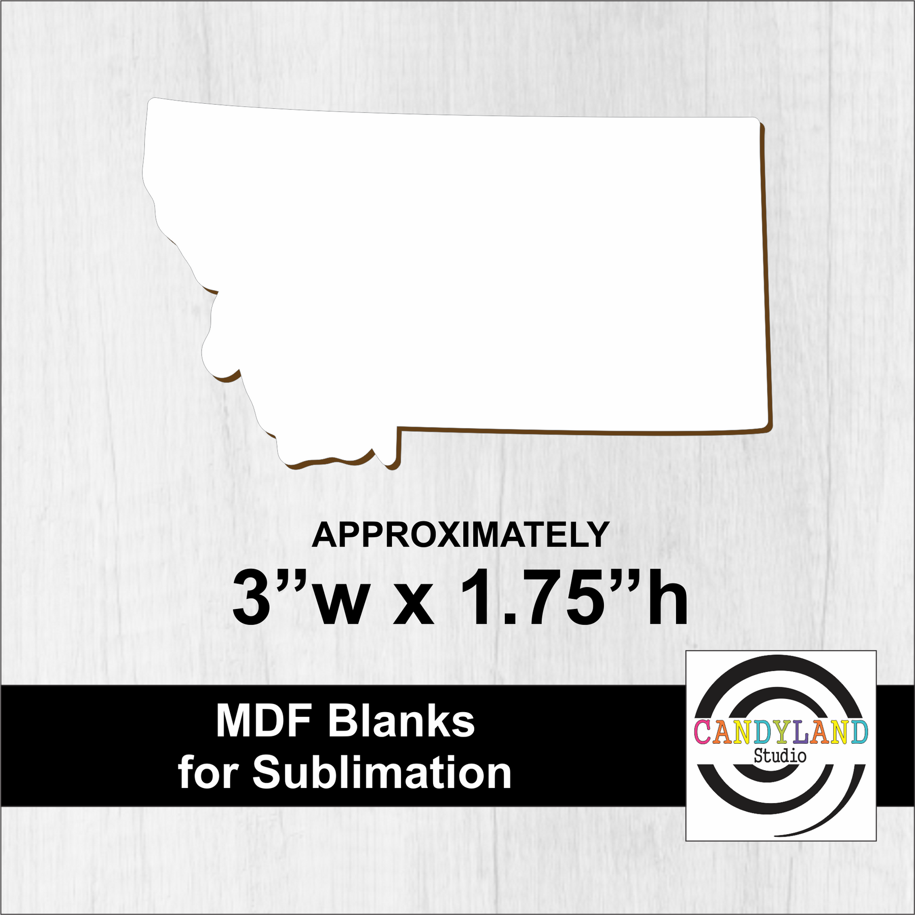 Custom cut Montana state shaped single sided MDF blank is approximately 1/8" thick, glossy white side(s) can be sublimated. Create bag charms, magnets, name tags & more!