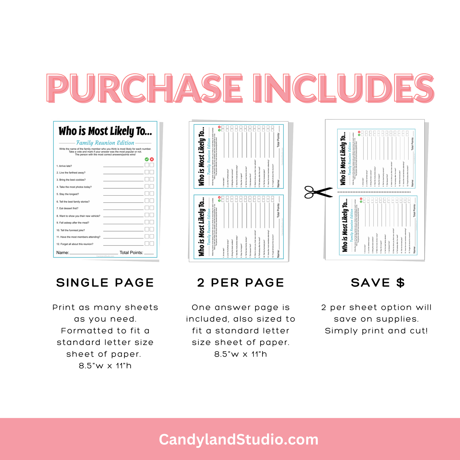 PDF printable with 12 "Most Likely To" questions, specifically tailored for family reunions