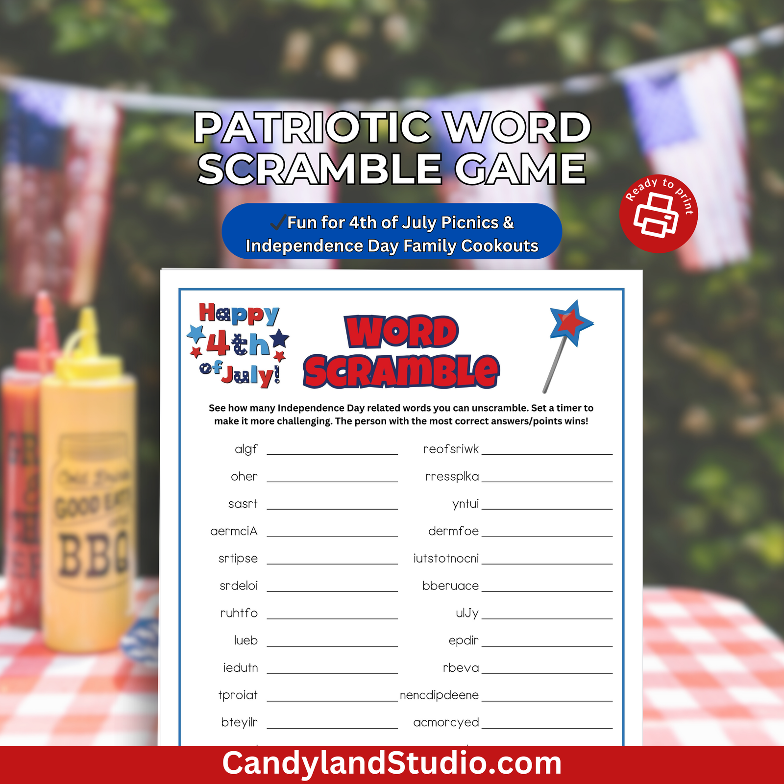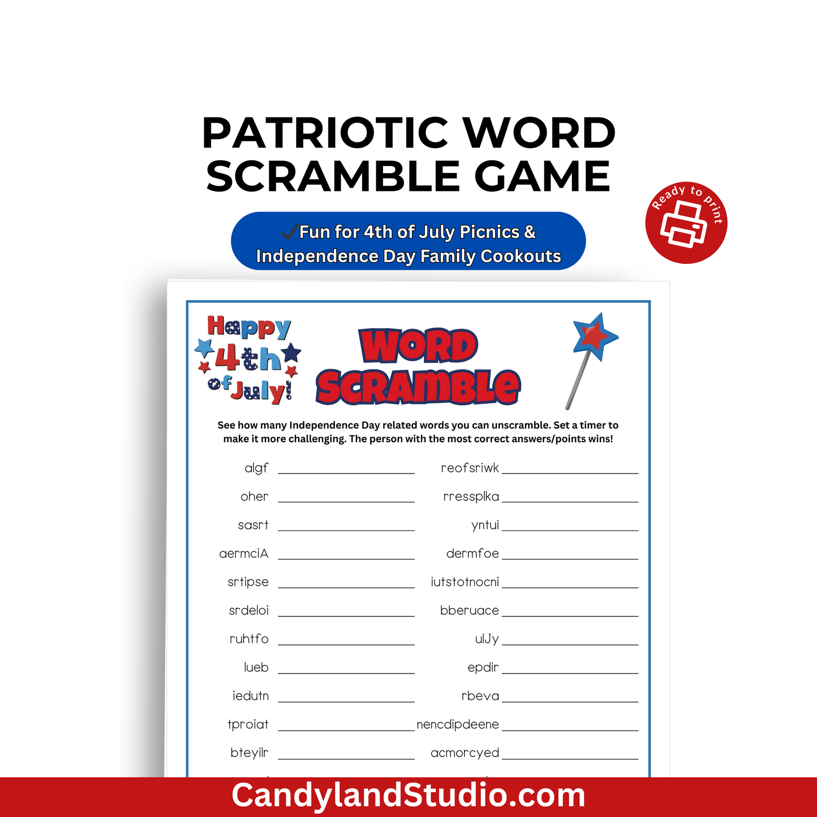 🧠 Challenge your guests to unscramble words related to freedom, fireworks, and the American spirit! Easy to print and play — no prep required!