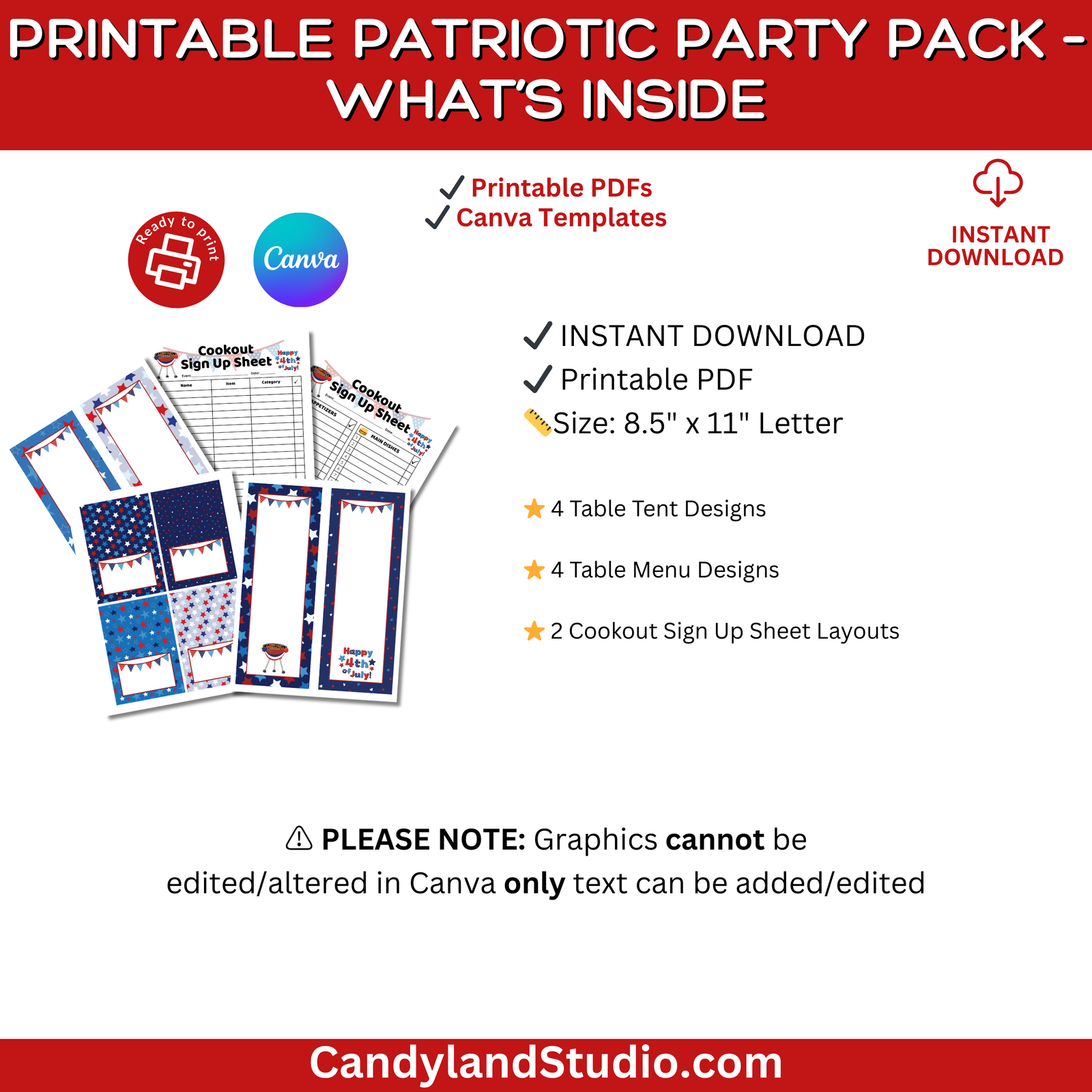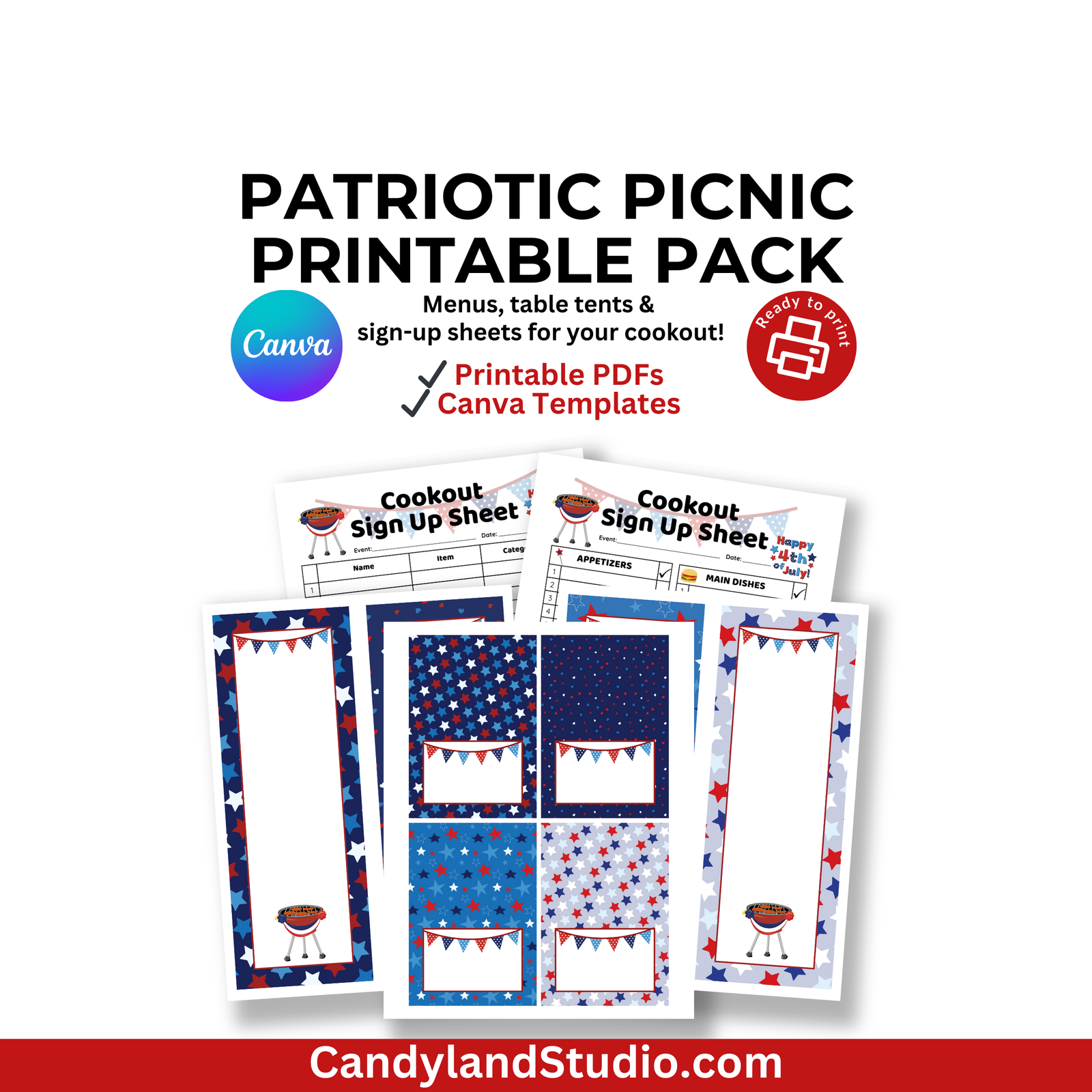 Keep your celebration stress-free and organized with this festive Patriotic Picnic Printable Pack! Featuring red, white, and blue flair, this bundle includes everything you need to label food, display menus, and track who’s bringing what—whether you're hosting a backyard BBQ, family potluck, or workplace cookout.