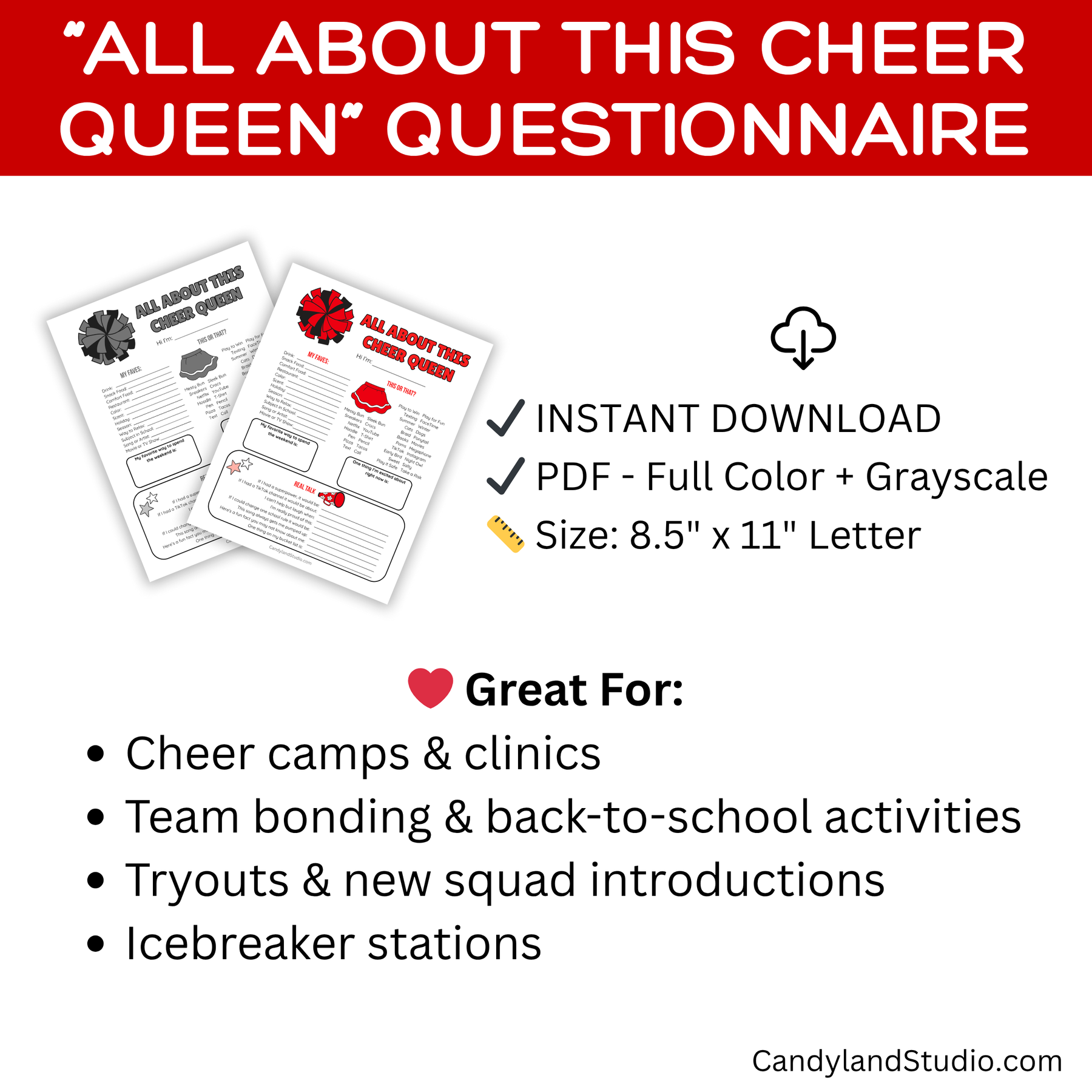 This “All About Me” cheerleading icebreaker worksheet is perfect for team bonding at cheer camp, tryouts, or rec practices! Featuring bold graphics and fun, get-to-know-you prompts, it helps cheerleaders connect and build team spirit. Specifically designed for schools with team colors Red & Black!