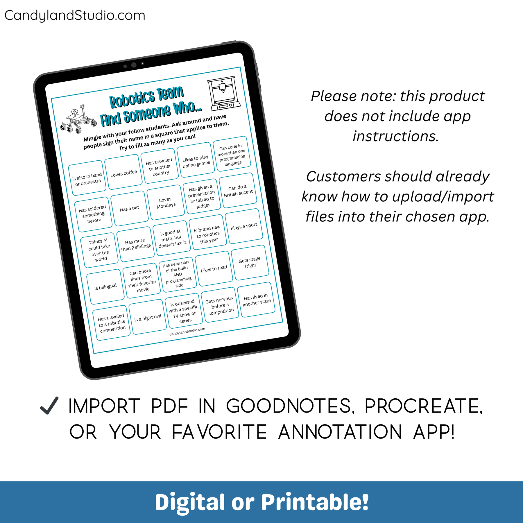 Find out who can do a British accent, who has soldered before, and who is brand new to robotics. Quick and easy team building activity for coaches and mentors of middle or high school Robotics Team. Simple, no-prep, print and play icebreaker is a fun way to spark conversation and build connections!