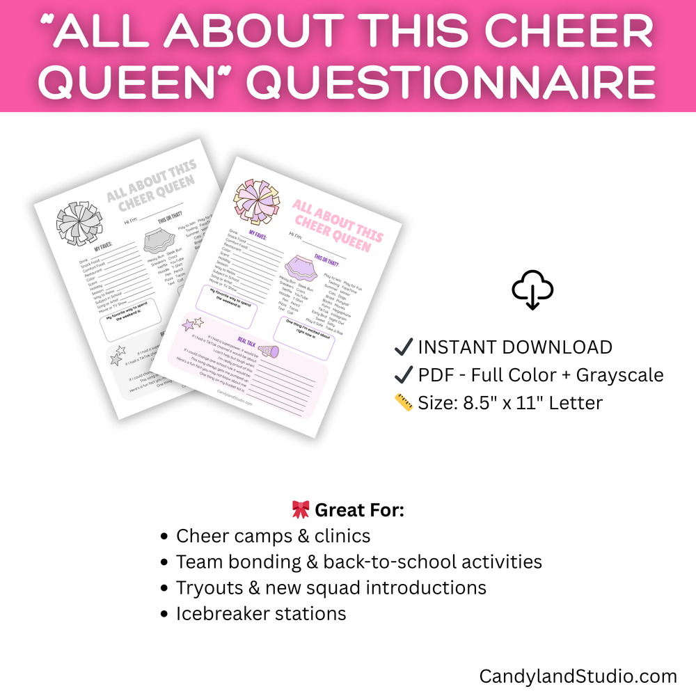 This “All About Me” cheerleading icebreaker worksheet is perfect for team bonding at cheer camp, tryouts, or rec practices! Featuring bold graphics and fun, get-to-know-you prompts, it helps cheerleaders connect and build team spirit.