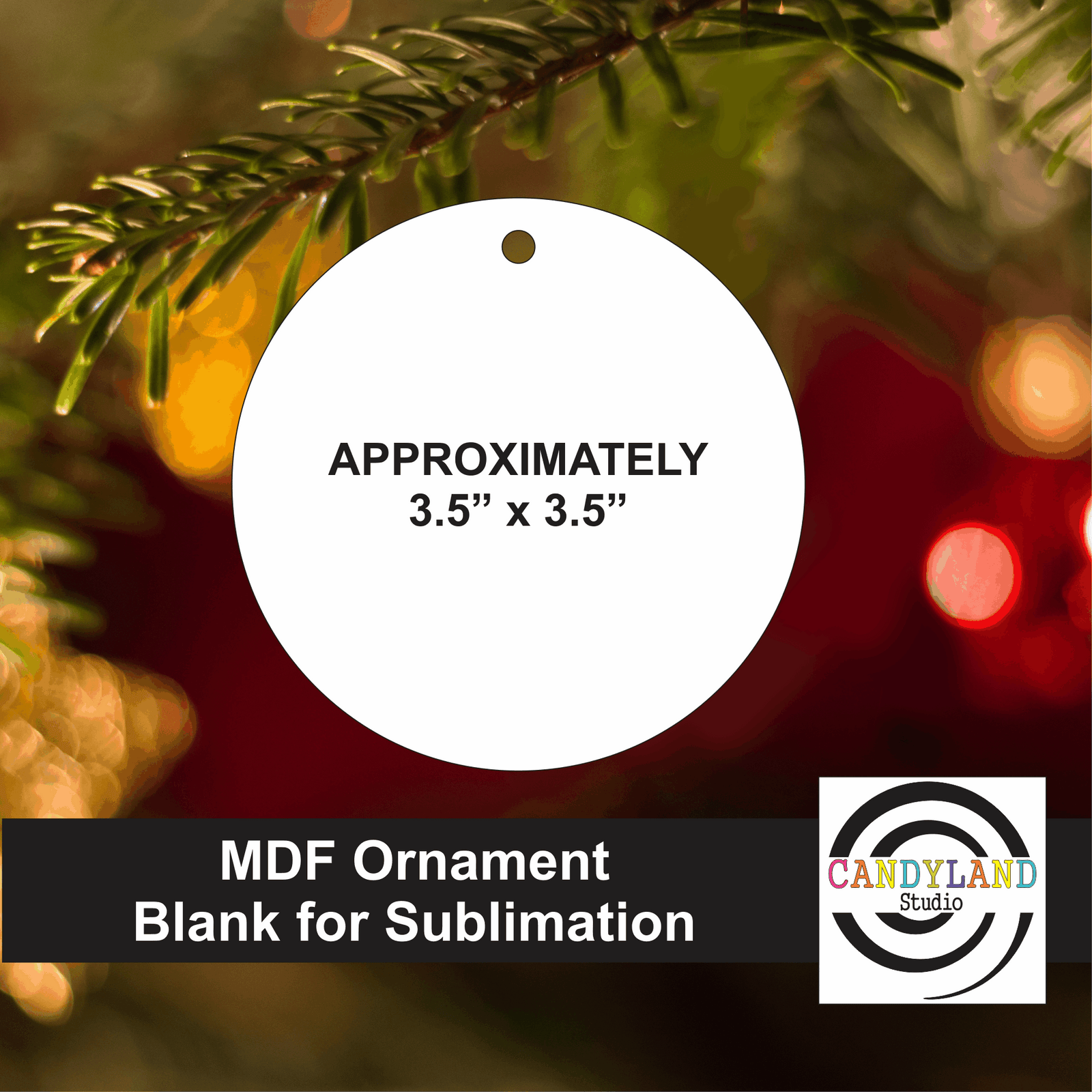Custom cut 3.5" round circle ornament available in single or double sided MDF hardboard blank is approximately 1/8" thick, glossy white side(s) can be sublimated. Cord/ribbon not included.