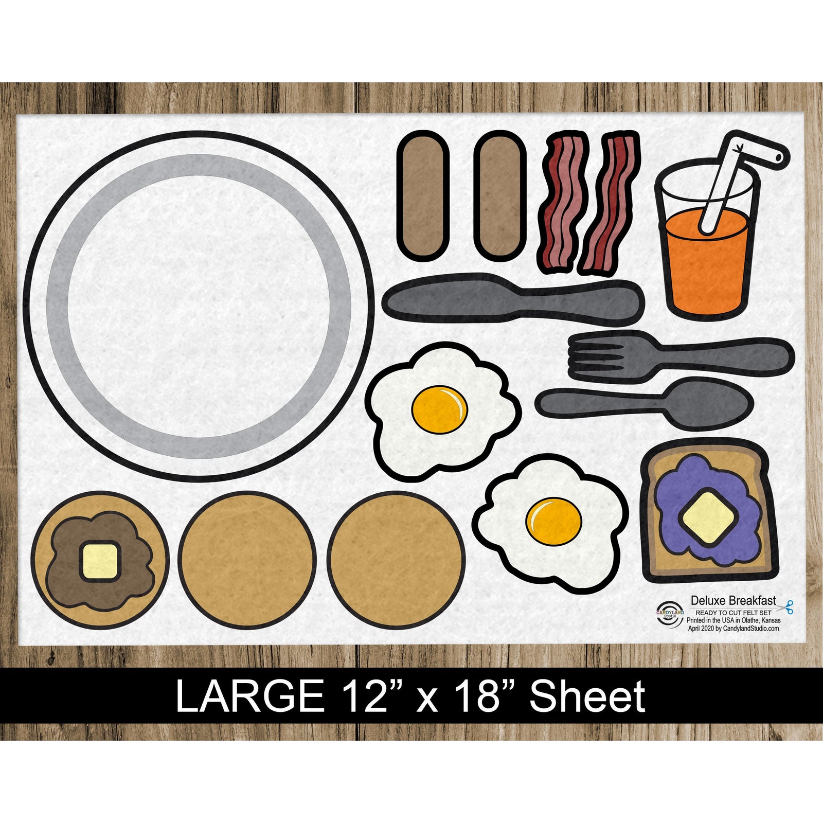 Deluxe Breakfast flannel board set features adorable breakfast food related pieces for a total of 15 pieces once cut - Breakfast plate, three pancakes (one with butter & syrup), two sausage links, two strips of bacon, fork, spoon, knife, two eggs, grape jelly toast, orange juice.