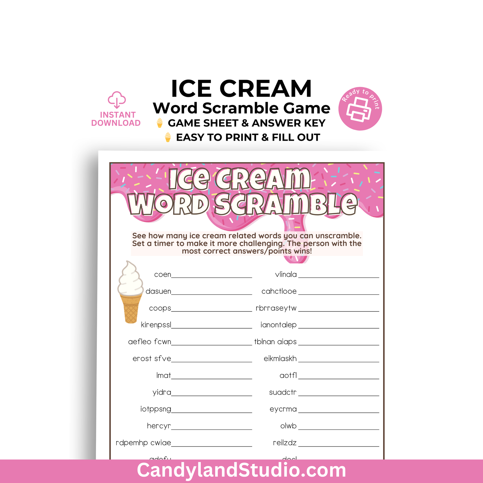Ice Cream Word Scramble Game Sheet (includes 2 per sheet option)